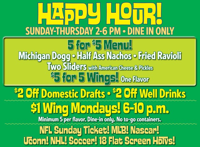 All Day Sundays, Monday and Thursdays after 6pm - $1 wings, minimum of 5 per sauce. No to go containers, Dine-in only.